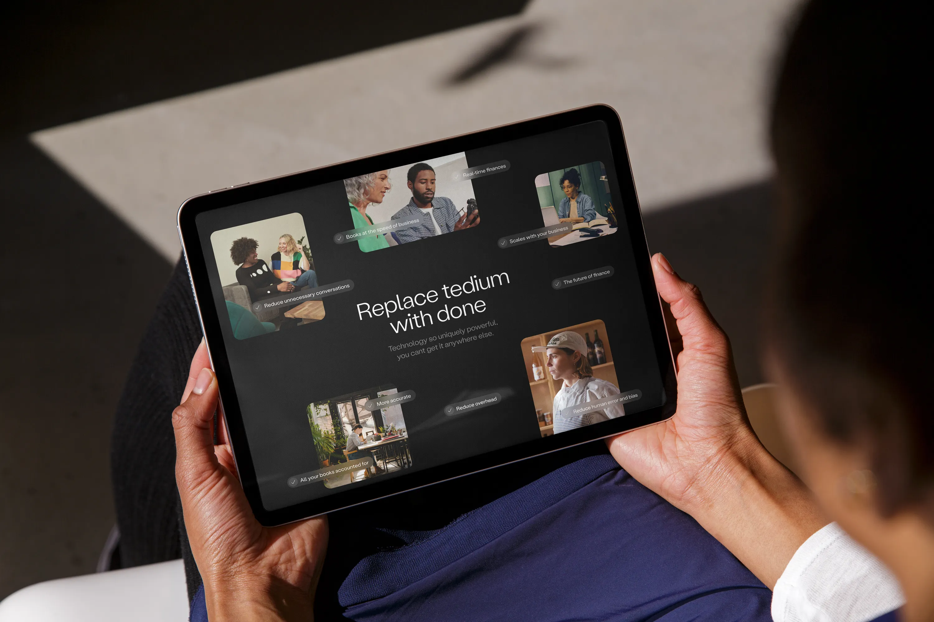 The new visual expression embraces the duality between data driven and sleek AI solution and warm and relatable everyday moments of small business owners.